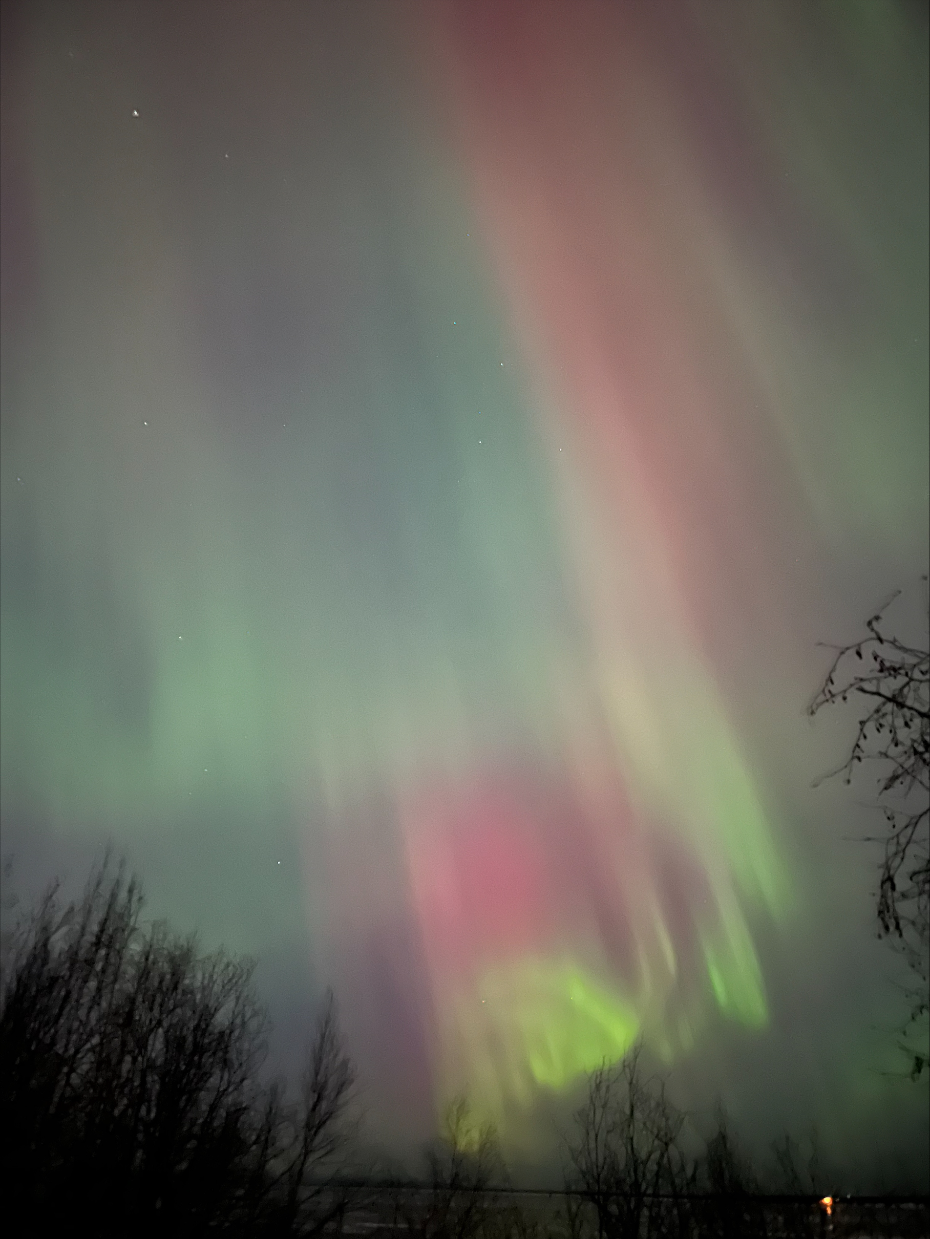 Stunning. Beautiful picture. Once saw it in Massachusetts. We all went out in the middle of the night on the hospital roof to watch it. Not colorful like that one! So amazing.